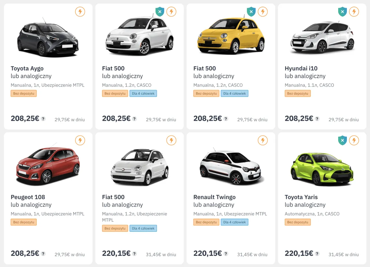 - Wypożyczalnie oferują różne klasy samochodów, co wpływa na ich ceny.